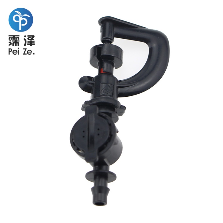 The sprinkling radius of bilateral wheel micro nozzle is 2.5m-3.0m. The normal working pressure is about 0.2MPa. The water yield is 60-80L/h (single nozzle). The nozzle can sprinkle water in a circle, enabling a large humidification area, it has even water yield and a long service life. The product can be installed conveniently and disassembled easily and can be used together with inversion connectors (e.g. counterweight, anti-seepage device). It is usually used for sprinkling irrigation of fruit trees and temperature reduction of greening belts, greenhouses, nursery gardens and indoor spaces.